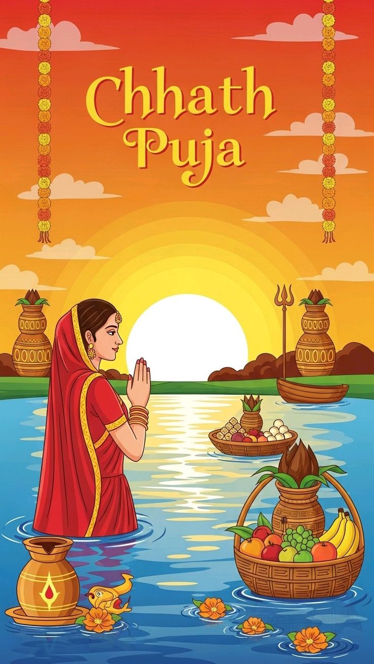 Devotees stand in water, holding soop filled with fruits, sugarcane, and thekua, and offer Arghya to the Sun.