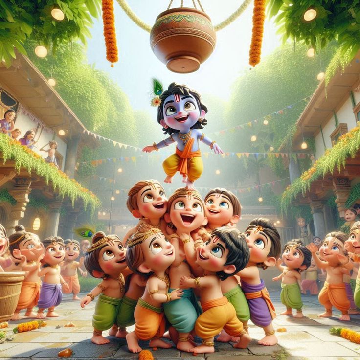 बाल कृष्ण और उनके दोस्तों को माखन बहुत पसंद था। वे ऊँचाई पर रखी मटकी से माखन चुराने के लिए मिलकर पिरामिड बनाते थे।