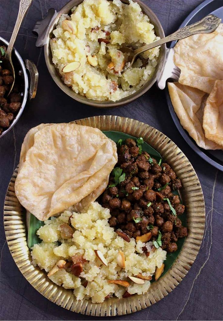 Poori – represents prosperity and wholeness. Halwa – symbolizes sweetness, joy, and positivity in life. Kala Chana – stands for strength, energy, and good health.