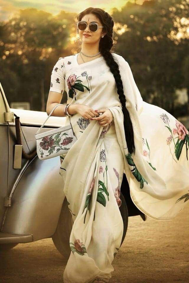 Start Navratri with grace in a white embroidered saree, just like Keerthy’s elegant drape. Perfect for invoking purity.